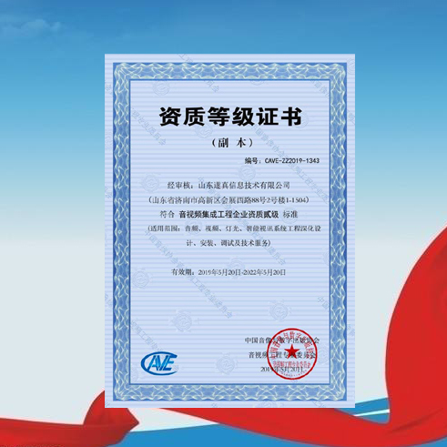 公司獲得中國音像協會音視頻工程專業(yè)委員會頒發(fā)的《音視頻集成工程企業(yè)資質貳級》證書,成為省內首批通過該權威機構認證的二級資質企業(yè)。